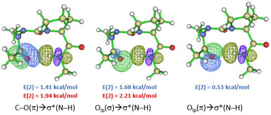 Intramolecular HB interactions found in the molecules in the gas phase (Figure 2) were also inspected using Natural Bond Orbital (NBO) theory at the two levels of theory. The strength of the HB in azapeptides models was estimated using the second-order perturbation analysis (E(2) value) [44].