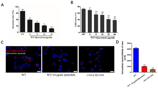 Quercitrin inhibits the invasion of S. Typhimurium into host cells and alleviates bacterial- mediated cell damage. (A) Inhibitory effect of quercitrin on the invasion of S. Typhimurium. HeLa cells were infected with S. Typhimurium SL1344 pretreated with quercitrin. Invasion rate = Intracellular bacteria of the treatment group/Intracellular bacteria of the WT group × 100%. The WT group without treatment was stated as 100%. (B) Quercitrin protects HeLa cells from S. Typhimurium-mediated damage. The LDH released data showed that the degree of HeLa cells damage caused by S. Typhimurium was significantly reduced after pretreatment with quercitrin. (C) Quercitrin significantly inhibits the invasion of S. Typhimurium (Magnification 1000×). Red fluorescence, intracellular bacteria; yellow fluorescence, extracellular bacteria; blue fluorescence, nuclei. (D) The immunofluorescence staining images of five different visual fields were collected, and the number of all invasive bacteria was counted by Image J (https://imagej.net/software/ accessed on 26 May 2023) (NIH, Bethesda, MA, USA) and compared with the untreated group and compared to the WT control group. * p < 0.05, ** p < 0.01 compared to the WT control group.