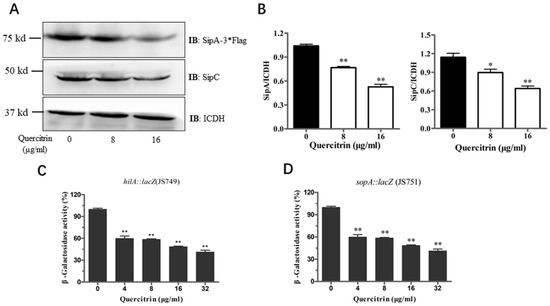 The above results showed that quercitrin inhibited the translocation of T3SS effector SipA. Western blot was used to detect whether quercitrin inhibited the expression of related effectors. It was found that quercitrin inhibited the expression of SipA and SipC in a dose-dependent manner (Figure 5A). Compared with the untreated group, quercitrin inhibited the expression of SipA by more than 50%, and the expression of SipC, another effector responsible for translocation and actin regulation, decreased by more than 30% (Figure 5B). β-Galactosidase activity assay was used to detect the expression of other important genes. The results showed that quercitrin significantly reduced the expression of hilA and SopA, which are mainly responsible for the regulation and function of S. Typhimurium T3SS (Figure 5C,D).