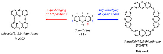 We focus on the 1,4-dithiin-embedded heterocycle compound, thianthrene (TT; Figure 1 (center)), as a building block. TT is a nonplanar heterocycle bent by sulfur. When developing sulfur-rich π-electron systems, it is important to attain remarkable electrochemical [60,61,62,63,64], photophysical [65,66,67], and molecular dynamics properties [68,69]. Parola et al. (2007) successfully synthesized the smallest family, thiacalix[2]-1,9-thianthrene (Figure 1 (left)), which was bridged at the 1,9-positions of the TT unit, from a thiacalix[4]arene derivative under high-temperature [70]. They revealed that this macrocycle adopts a flattened cone conformation with a concave internal cavity that can capture metal cations [71]. Conversely, investigating how the number of TT units and the ring sizes act on their characteristics is important for clarifying the features of this family. TT units should be connected at other sides instead of 1,9-positions to expand the macrocyclic ring sizes. Thus, we attempt to synthesize a larger cyclic tetramer bridged at the 2,8-positions of TT, thiacalix[4]-2,8-thianthrene (TC[4]TT; Figure 1 (right)).