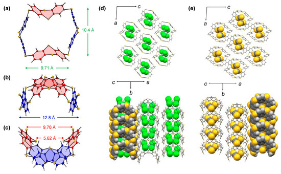 Single crystals of TC[4]TT were obtained by slowly evaporating CHCl3 and CS2. Both crystals belonged to the I2 space group with a monoclinic crystal system. The inwardly folded (Figure 2a, painted in red) and protruding TT (painted in blue) units alternatively shaped a macrocyclic skeleton and adopted concave octagonal geometry. Interestingly, this conformer was energetically unstable as a single molecule in vacuo compared with its structural isomer in which all TT units are flared, and the estimated total energy difference was ca. 0.13 kcal mol−1 (Figure S22). The folding angles of the constituent TT units were 124.9(1) and 136.1(1)°. The inwardly folded TT bent sharply compared with the linear dimer TT2S (corresponding angles: 137.1(1) and 130.4(1)°). The TT units distorted as a result of macrocyclization. The distances between the sulfur bridges were 9.71 and 10.4 Å, respectively. Although the distance between two flared TT units was 12.8 Å, the distance was 5.62 Å at the narrowest part and 9.70 Å at the widest parts of the collapsed TT units (Figure 2b,c). Thus, TC[4]TT possesses a specially shaped internal cavity. In the crystal structure, the solvents (CHCl3 and CS2) were included in the cavity of TC[4]TT, and the composition ratio of compound and solvent was 1:2 (Figure 2d,e; (TC[4]TT)(CHCl3)2 and (TC[4]TT)(CS2)2). For CHCl3 and CS2, the two molecules in the cavity fit in a V-shape along with the lamination direction. Although we attempted to incorporate solvents with different sizes, such as benzene, 1,4-dioxane, and chlorobenzene, into TC[4]TT, parsable crystals were not obtained. In donor–acceptor-type complex formations with C60 and C70, distinct complexation could not be observed. This result shows that TC[4]TT can selectively capture relatively small molecules in the crystal state. Thus, TC[4]TT can expect selective inclusion with small organic molecules and metal ions similar to thiacalixarene derivatives. Notably, intermolecular interactions between TC[4]TT and each encapsulated solvent were not observed, suggesting that the solvent molecules just fit in the cavity. Conversely, differences were observed in the intermolecular packing forces acting among TC[4]TT, while (TC[4]TT)(CHCl3)2 and (TC[4]TT)(CS2)2 were the same crystal system. The clathrate crystal of TC[4]TT and CHCl3 contains some C–H···π interactions and C–H···S contacts [77] between four adjacent molecules. Its columnar stacking was also built by C–H···π interactions along the ac axis and C–H···S contacts along the b axis (Figure S15). In comparison, (TC[4]TT)(CS2)2 was formed by some atomic contacts, such as C–C, C–S, and S–S contacts, in addition to these interactions (Figure S17). The density of the crystals was 1.591 for (TC[4]TT)(CHCl3)2 and 1.491 for (TC[4]TT)(CS2)2. The crystal of (TC[4]TT)(CS2)2 was packed more densely than that of (TC[4]TT)(CHCl3)2. Thus, coupled with the pseudo hexagonal geometry consisting of imminent sulfur of TT and the linker, TC[4]TT was arranged in a honeycomb style with a channel structure due to molecular tiling. These results suggest that TC[4]TT exhibits adsorption and transport properties and shows potential as an organic porous solid material.