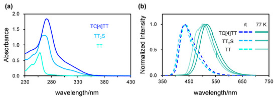 (a) Absorption spectra of TC[4]TT, TT2S, and TT in a CH2Cl2 solution. (b) Emission spectra of TC[4]TT, TT2S, and TT in a CH2Cl2 solution at room temperature and 77 K. The solution concentration is 2.0 × 10−5 mol L−1. The excitation wavelengths are 271 (TC[4]TT), 268 (TT2S), and 258 nm (TT). Phosphorescence spectra at 77 K were measured with a delay of 15 ms.