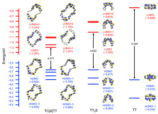 Calculated molecular orbitals of TC[4]TT, TT2S, and TT at the RB3LYP/6-31G(d,p) level.