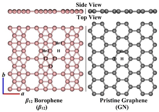Side and top perspectives of the relaxed structures of 3 × 4 × 1 β12 borophene (β12) and 6 × 5 × 1 pristine graphene (GN) with the studied adsorption sites. The boron and carbon atoms are represented by pink and gray colors, respectively. Top, hollow, and bridge adsorption sites are referred to as T, H, and Br, respectively.