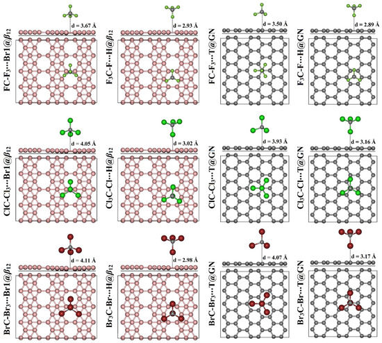 The adsorption of tetrahalomethanes CX4 (where X = F, Cl, and Br) on the surfaces of β12 and GN was investigated at different adsorption sites within the tetrel (XC-X3)- and halogen (X3C-X)-oriented configurations. The adsorption energies and the corresponding equilibrium distances of all relaxed CX4∙∙∙β12/GN complexes were calculated and are summarized in Table 1. Figure S1 illustrates all relaxed complexes. The relaxed CX4∙∙∙β12/GN complexes at the most energetically preferable adsorption sites are displayed in Figure 3.