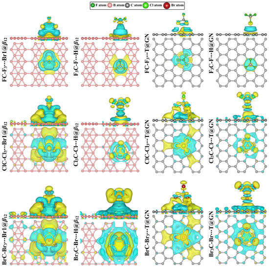 Charge density difference (∆ρ) maps of the relaxed CX4∙∙∙β12/GN complexes (where X = F, Cl, and Br) at the most preferable adsorption sites within tetrel (XC-X3)- and halogen (X3C-X)-oriented configurations. Regions with cyan and yellow colors refer to depletion (negative) and accumulation (positive) charges, respectively. The isosurface values for the CX4∙∙∙β12 and ∙∙∙GN were set to be 3.08 × 10−5 and 5.0 × 10−5 e/Å3, respectively.