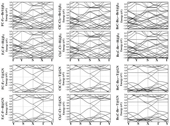 Band structure plots for the relaxed CX4∙∙∙β12/GN complexes (where X = F, Cl, and Br) at the most preferable adsorption sites within tetrel (XC-X3)- and halogen (X3C-X)-oriented configurations. The Fermi energy was positioned at zero energy.