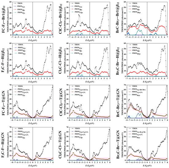 Total density of state (TDOS) plots for the relaxed CX4∙∙∙β12/GN complexes (where X = F, Cl, and Br) at the most preferable adsorption sites within tetrel (XC-X3)- and halogen (X3C-X)-oriented configurations. The projected density of state (PDOS) with the contribution of Bp, Cp-GN, , and . The Fermi energy was set at zero energy.
