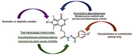 The N-acylhydrazone (NAH) moiety is one of the most extensively studied privileged structures in medicinal chemistry nowadays. This substructure is present in a great number of potent compounds with various pharmacological activities such as anticancer, antimicrobial, antiviral, anti-platelet, antinociceptive, and anti-inflammatory [23,24,25,26,27,28,29,30,31,32,33,34,35]. It should be noted that N-acylhydrazone derivatives can affect different molecular targets and signaling pathways associated with inflammatory disorders. The literature reports diverse drug candidates possessing NAH residue, which act as COX and/or LOX inhibitors, transient receptor potential cation channel subfamily V member 1 (TRPV1) antagonists, and others that modulate the release and activity of cytokines and reveal antioxidant activity. The complex and wide-range anti-inflammatory effect of N-acylhydrazones can be explained by the relative acidity of the amide hydrogen and its ability to stabilize free radicals. Therefore, the NAH group can imitate the bis-allylic moiety of PUFAs such as AA [23,24,29,30,31,32,33,34,35].