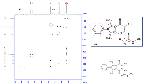 The heteronuclear multiple bond correlation (HMBC) spectrum of compound 4b [36]. A red dashed line marks correlations between the methylene group and 3-CH3 substituent, which would have appeared in the case of N-isomer (structure below 4b).