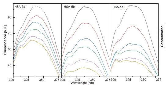 Fluorescence quenching spectra of human serum albumin (HSA) in the presence of different concentrations of compounds 5a, 5b, and 5c (T = 297 K, λex = 280 nm). The concentration of HSA was 1.0 µM, and the concentrations of 5a, 5b, and 5c were 0, 0.4, 0.8, 1.2, 1.6, and 2.0 µM.