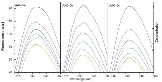 Fluorescence quenching spectra of alpha-1-acid glycoprotein (AAG) in the presence of different concentrations of compounds 5a, 5b, and 5c (T = 297 K, λex = 280 nm). The concentration of AAG was 1.0 µM, and the concentrations of 5a, 5b, and 5c were 0, 0.4, 0.8, 1.2, 1.6, and 2.0 µM.