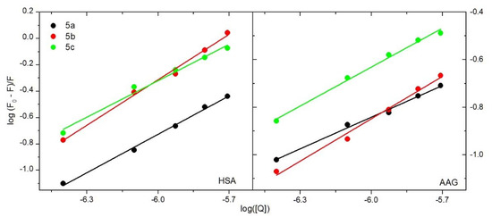 Double logarithm regression plots for quenching of human serum albumin (HSA) (left) and alpha-1-acid glycoprotein (AAG) (right) by compounds 5a, 5b, 5c.