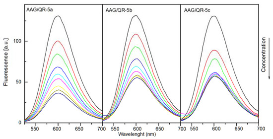 Similar to HSA systems, we introduced successive portions of the analyzed 5a, 5b, and 5c to a solution containing equimolar amounts of orosomucoid and QR. We used a 500 nm excitation wavelength. In these conditions, the maximum emission spectra were located near 600 nm. We increased the molar ratio of the reactants from 1:1:0 to 1:1:10. The spectra obtained for the three analyzed systems are shown in Figure 13. The intensity of fluorescence decreases during the addition of successive portions of the analyzed compounds. This proves the replacement of quinalidine red molecules by the tested compounds and confirms that 5a, 5b, and 5c bind to the AAG.