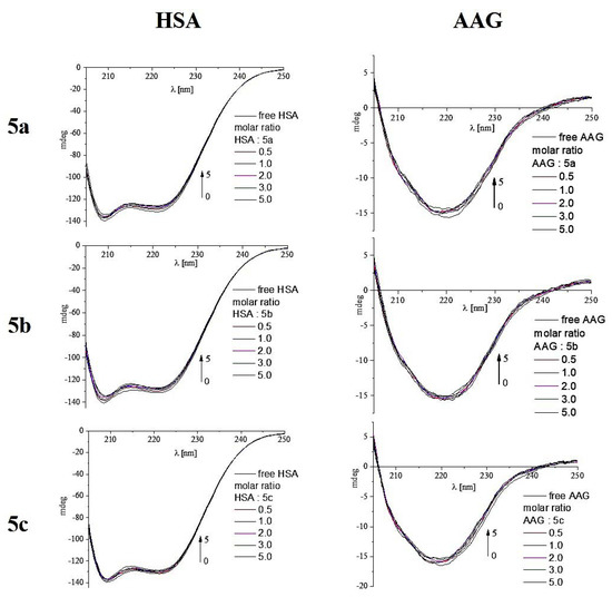 After administration, drugs are bound and transported by blood proteins which affect their pharmacokinetics in vivo. Therefore, we performed experiments estimating the binding mode of title N-acylhydrazone derivatives with human serum albumin (HSA) and alpha-1-acid glycoprotein (AAG), which are the most abundant plasma proteins. The interactions between new compounds and HSA and AAG were monitored by optical techniques such as CD, fluorescence spectroscopy, and molecular docking studies [57]. Since the structures of all compounds are very similar and studies of interactions with proteins are time-consuming and laborious, we decided to conduct these preliminary experiments for derivatives from the 5 series 5a-5c. Moreover, we decided to conduct a study of the interaction with plasma proteins for compounds 5a-5c, i.e., those with unsubstituted phenyl ring in NAH moiety, because we found that the R1 substituent may potentially have the greatest impact on the interaction with macromolecules. This substituent most differentiates this group of compounds in terms of structure.