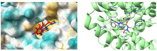 The location of 5b (red), nordihydroguaiaretic acid (green), and ligand C8B (yellow) into the 15-LOX channel (right). Docking pose of 5b (left). Hydrogen bonds are marked in red.