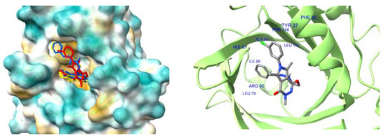 The location of 6b (red) and meloxicam (yellow) in the COX-2 pocket (left). Docking pose of 6b (right). Hydrogen bonds are marked in red.