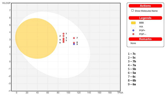 The studies have shown that the tested derivatives have an affinity to both isoforms of cyclooxygenase; however, they inhibit the activity of COX-2 much stronger than COX-1. Only compound 7c does not affect the COX-1 isoform and acts as a selective COX-2 inhibitor. On the other hand, 6c turned out to be the most potent COX-2 inhibitor, in case of which 50% inhibition of the activity of the enzyme occurred at the lowest concentration. It is worth noticing that all tested compounds are statistically significantly more effective COX-2 inhibitors than meloxicam. The COX-2/COX-1 selectivity index of all tested derivatives is also superior to this reference drug. In relation to the COX-1 isoform, the activity of tested compounds is rather similar to meloxicam. The differences are statistically significant only in the case of 5a, 6a, 5b, and 6c. The COX-2 inhibitory activity of title N-acylhydrazones is much lower compared to celecoxib. On the other hand, with reference to diclofenac, the examined derivatives revealed comparable affinity to COX-2 and significantly lower to COX-1 at the same time. Only 6c was statistically significantly more potent in inhibiting COX-2 than diclofenac.