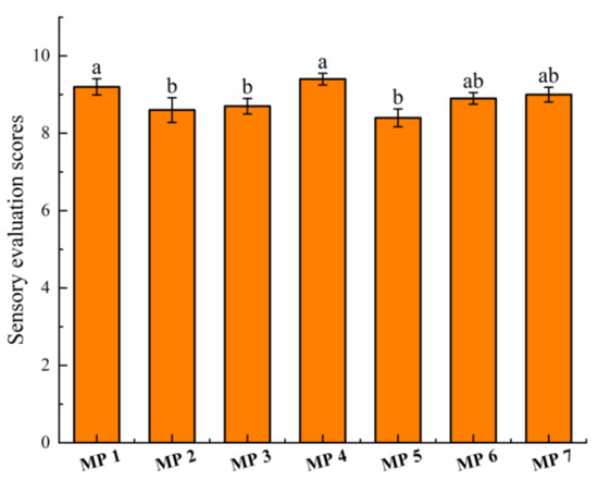 The sensory evaluation scores of seven MPs. Values with different superscript roman letters (a,b) in the column are significantly different according to the Duncan test (p < 0.05).