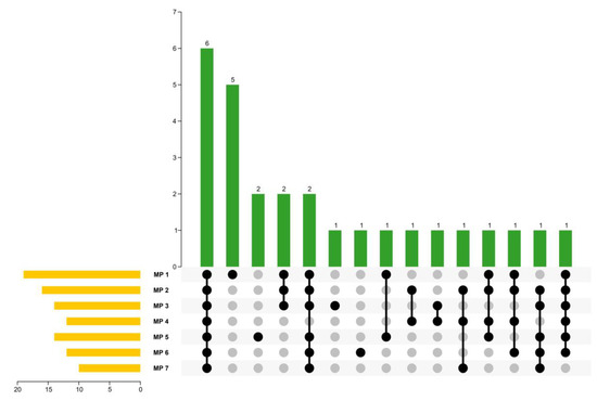The upset plot of the seven MPs. Yellow bars represent the number of volatile compounds identified in the seven MPs. Gray dots represent absence, while black dots represent the presence of the unique compounds. If more than one sample contains the same unique compound, they are connected with lines. The number of unique compounds presented individually or jointly is represented by green bars.