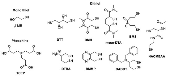 Given the significance of Cys and disulfide bridges, disulfide-reducing agents are frequently used to stabilize free sulfhydryl groups and reduce disulfide bonds in peptides and proteins [1,9]. The most ubiquitous dithiol reducers are broadly classified into two categories, namely thiol-based reversible reducers (monothiols and dithiols) and phosphine-based irreversible reducers (Figure 1) [1].