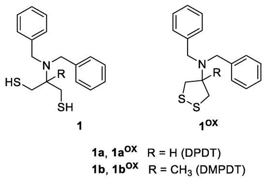 The design and efficiency of novel disulfide-reducing reagents based on dithiol molecules often depend on their capacity to form a stable cyclic compound in its oxidized form [19]. Synthetic dithiol-reducing agents mostly form a 6-member ring (or higher) when in an oxidized form (Figure 1). However, the formation of a 5-member ring, as is the case of dihydrolipoic acid, is also a favored structure [20]. In previous studies, DTBA [14] and DABDT [16] were synthesized from aspartic acid to obtain the corresponding dithiol-reducing agents. In the study presented herein, we pursued a starting material that does not contain carboxylic acids, thereby avoiding the use of a stronger reducing agent like lithium aluminum hydride (LAH). Further, the resulting reducing agent forming a 5-membered ring in its oxidized form is used for comparison to determine if it serves as a better disulfide-reducing agent. In this regard, we identified two suitable candidates as starting materials, namely serinol (2a; 2-aminopropane-1,3-diol), which would lead to DPDT (1a), and methyl serinol (2b; 2-amino-2-methylpropane-1,3-diol) for the synthesis of DMPDT (1b) following the synthetic route depicted in Scheme 1.