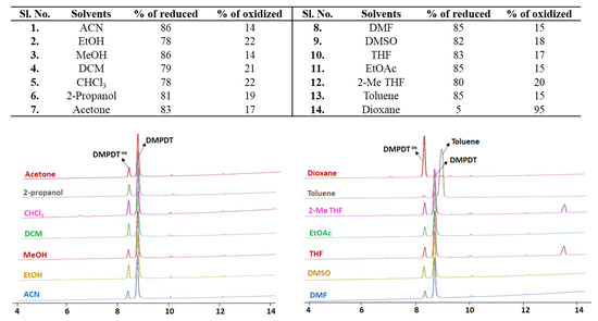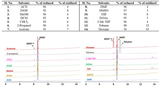 Furthermore, DPDT and DMPDT were soluble in a wide range of organic solvents of different polarities (see Figure 3 and Figure 4 for the solvents tested). The solutions were injected into the HPLC to study their compatibility with the different solvents. For DPDT, in all cases except toluene and dioxane, practical oxidation was not detected (the oxidized form was present in approximately 4–8% with respect to the reduced form; Figure 3). On the other hand, for toluene and dioxane, the presence of the oxidized form reached 12% and 43%, respectively. In the case of the latter, this high percentage can be attributed to the presence of peroxides. This result was confirmed when the same experiment was carried out with DMPDT, which showed a 95% formation of the oxidized form in dioxane (Figure 4). In the rest of the solvents tested, DMPDT showed a greater formation of the oxidized form than DPDT. Interestingly, neither compound showed important oxidation in DMSO. However, given the results obtained, DMPDT was abandoned. DPDT also showed full stability in ACN for at least 11 days (SI Figure S33).