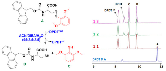 3.1.9. General Procedure for the Study of DPDT as a Reducing Agent in Solution Phase for Fmoc-Cys(SDMP)-OH