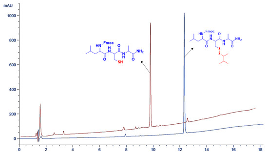 Furthermore, we examined the reducing capacity of DPDT on a protected Cys tripeptide anchored on solid phase. SIT (sec-isoamyl mercaptan) was used as the protecting group of Cys. As this group is more stable than SDMP, its removal is more demanding that in the previous case. The peptidyl resin experiments were designed to use 15 eq. of DPDT divided into three portions. Thus, the peptidyl resin (Fmoc-Ala-Cys(SIT)-Leu-rink amide resin) was subjected to three × 10 min treatments with 5 eq. of DPDT in a mixture of DMF/DIEA/H2O (95:2.5:2.5) as solvent. An analysis of the peptides after cleavage from the resin confirmed the almost quantitative disulfide reduction rendering the unprotected Cys tripeptide (Figure 6). In parallel, the same experiment conducted using DTT as the reducing agent (SI Figure S37) resulted in comparable results.
