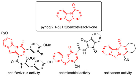 Pyrido[2,1-b][1,3]benzothiazol-1-ones (Figure 1) are valuable scaffolds for medicinal chemistry. For example, their derivatives were found to be useful in the development of antiviral (anti-dengue [1], anti-flavivirus [2,3], inhibitors of NS5B polymerase of hepatitis C virus [4], antivirals against respiratory syncytial, influenza (Flu-V), and herpes simplex viruses [5]), antimicrobial (against Gram-positive bacteria (Bacillus subtilis, Bacillus thuringiensis) [6]), and anticancer (against HepG2 liver cancer cells [7] and Ehrlich-Lettre ascites carcinoma cells [8]) agents (Figure 1).
