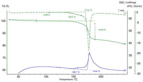 STA plot of thermolysis of compound 4. Blue solid curve: differential scanning calorimetry (DSC); green solid curve: thermogravimetry (TG); greed dashed curve: derivative thermogravimetry (dTG); heating rate: 10 K/min; argon atmosphere.