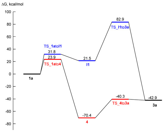 Note that results of DFT calculations of total electronic energies, enthalpies, and Gibbs free energies of activation for elementary stages of different pathways for 1a → 3a transformation (Figure 5, Table 3) also revealed that transformation 1a → 3a occurred via intermediate 4, whereas the formation of alternative intermediate I1 was found to be highly thermodynamically and kinetically unfavorable.