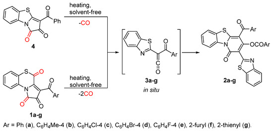For the development of the approach to pyrido [2,1-b][1,3]benzothiazol-1-ones 2, we considered two types of potent sources of acyl(1,3-benzothiazol-2-yl)ketenes 3, APBTTs 1 [10,11] and 3-benzoylpyrrolo [2,1-b][1,3]benzothiazole-1,2-dione 4 (Scheme 3) [11]. Compound 4 was assumed to undergo a classical pattern for FPDs of thermal decarbonylation [9], cheletropic elimination of CO from C1=O position, affording the desired ketene 3a. Compounds 1 were hypothesized to undergo elimination of two molecules of CO from C1=O (as a classical pattern of thermal decarbonylation for FPDs [9]) and C4=O positions (as a reactivity feature of APBTTs 1, observed by us earlier in nucleophilic reactions [11]), affording the desired ketenes 3.