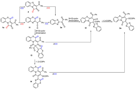 So, transformation of APBTT 1a to pyrido [2,1-b][1,3]benzothiazol-1-one 2a could proceed through several pathways, which are different combinations of two decarbonylations, [4+2]-cyclodimerization, and 1,3-acylotropic shift (Scheme 4). At the initial stage, APBTT 1a could undergo two patterns of decarbonylation, a classical variant of elimination of C1=O to afford ketene I1 [9], and an unusual variant of elimination of C4=O to give 3-benzoylpyrrolo [2,1-b][1,3]benzothiazole-1,2-dione 4. Then, intermediates I1, 4 could decarbonylate again to result in ketene 3a, which could undergo a [4+2]-cyclodimerization→1,3-acylotropic shift cascade, or intermediate I1 could undergo a classical pathway of [4+2]-cyclodimerization with a subsequent 1,3-acylotropic shift→decarbonylation or decarbonylation→1,3-acylotropic shift cascade.