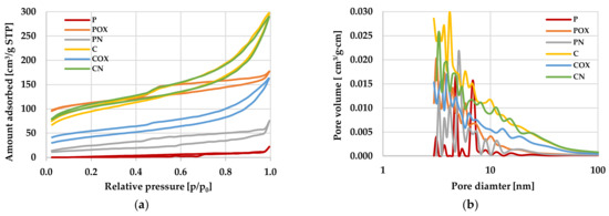 The data discussed above (Table 3) were additionally illustrated in Figure 1 presenting the isotherms of N2 adsorption/desorption on the activated biocarbons as well as the pore size distribution curves for the materials under investigation. The shape of isotherms (Figure 1a) confirmed significant differences between the porous structure of carbons activated with CO2 and H3PO4. The isotherms obtained for the P and PN biocarbons had a very irregular shape (which is quite typical for materials with a poorly developed porous structure) and it was difficult to determine their type according to the IUPAC classification. In case of the remaining activated biocarbon samples, the isotherms were smooth and their shape was similar to the IV type, characteristic of solids containing significant amounts of mesopores in the structure. Moreover, in the course of these isotherms, the wide hysteresis loops were observed (especially for the POX sample), which also confirmed the predominance of mesopores in the total pore volume. The final confirmation of the significant textural diversity of individual carbon materials were the pore size distribution curves presented in Figure 1b. According to these data, the “C”-series samples showed significantly higher values of pore volume, both in the range of small mesopores (diameter of 2–5 nm) as well as of large mesopores (size in the range of 10–50 nm).