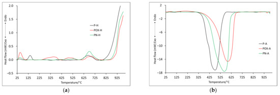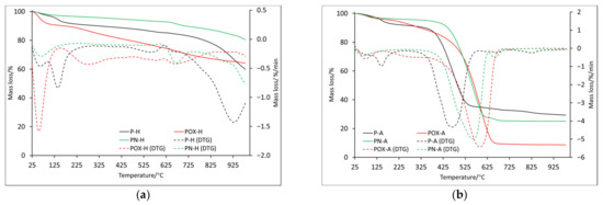In order to fully characterize the thermal properties of the prepared materials, thermal analyses were performed in two atmospheres: helium and air (symbols H and A, respectively). The TG (thermogravimetry) and DTG (differential thermogravimetry) curves obtained for samples after physical activation are presented in Figure 2a (helium) and Figure 2b (air). In order to better understand the processes taking place, measurements and analysis of the results obtained from differential scanning calorimetry (DSC) were also performed (Figure 3). The most important data of these measurements are collected in Table 4 and Table 5.