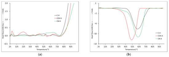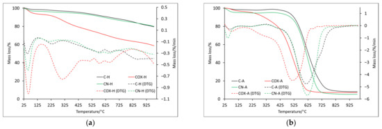 Just as it was in case of the physically activated samples, an endothermic process occurred associated with the evaporation of surface-adsorbed water in case of the chemically activated materials (analyzed both in helium and in air atmosphere) below 100 °C (T1/D1) (Figure 4 and Figure 5). Looking at the mass loss values recorded at the 100 °C (C-H: 1.4%, COX-H: 5.7%, CN-H: 3.2%, C-A: 1.4%, COX-A: 2.3%, CN-A:5.6%), we can see that they were not much different from those recorded for the physically activated samples, a slight increase in values was noticeable for the CN-H and CN-A samples.