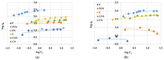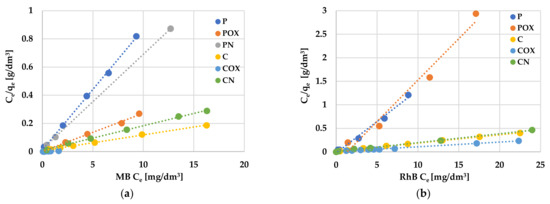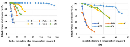 The most effective adsorbent was the COX sample, which sorption capacity towards both organic pollutants was significantly higher than for the other activated biocarbons. This was particularly visible in case of methylene blue removal, where the difference between the COX sample (qe = 278.99 mg/g) and the least effective adsorbent—P sample (qe = 11.75 mg/g) was as much as 267.24 mg/g. The COX sample was also characterized by the highest efficiency of MB and RhB removal from the liquid phase. According to the data presented in Figure 6a, this sample showed almost 100% efficiency in methylene blue removal in a very wide range of its initial concentrations, i.e., ranging from 5 to 130 mg/dm3. Moreover, a further increase in the initial concentration of MB to the level of 170 mg/dm3 resulted in a 10% decrease in adsorption efficiency. In case of the rhodamine B adsorption, the result was much less impressive, because 100% efficiency of dye removal was observed for its initial concentrations ranging from 5 mg/dm3 to 20 mg/dm3. Unfortunately, in case of the other biocarbons (in particular, for CO2-activated samples), the adsorption efficiency was definitely lower. The least favourable, in this respect, were the P and PN samples, which did not reach 100% efficiency even at the lowest concentrations of both dyes (below 5–10 mg/dm3). This ruled out the possibility of their practical application as potential adsorbents of organic pollutants.