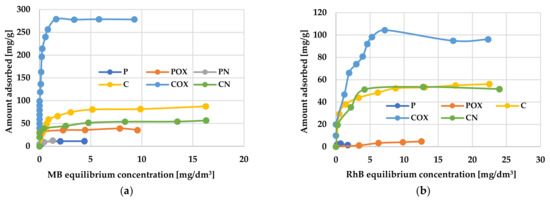 A very important factor determining the effectiveness of removing organic pollutants from aqueous solutions was the initial concentration of the adsorbate, because it was the driving force of the diffusive and mass transfer processes involved in adsorption process [48]. According to the data presented in Figure 7, the amounts of adsorbed methylene blue and rhodamine B increased significantly with increasing initial concentration of these dyes in the aqueous solution. This suggests that at lower cationic dye concentrations, their adsorption on the activated biocarbons surface is accidental. When the initial MB and RhB concentration increased, the number of collisions between the dye molecules and the activated biocarbons surface also increased, thus improving the effectiveness of adsorption process. In turn, at higher dye concentrations, all the active centers located on the adsorbents surface were completely occupied by MB or RhB molecules, and the surface/porous structure of the carbonaceous materials was fully saturated. Moreover, the smooth shape of the isotherms may indicate the monolayer coverage of the activated biocarbons surface with the dye molecules.
