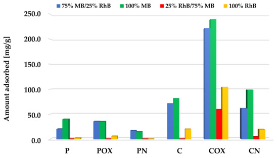 The situation was quite similar for the systems with equal concentrations of both organic dyes (Figure 11). Also, methylene blue adsorption was the preferred process here, especially in the case of the samples after physical activation, which were characterized by less favorable sorption abilities. However, in case of the samples after chemical activation (in particular, for COX activated biocarbon), adsorption of significant amounts of rhodamine B was also observed. This was most probably a consequence of the fact that the mixture of both cationic dyes contained much less MB molecules than in the previously discussed variant, which is why the porous structure of the samples was not fully saturated by them.