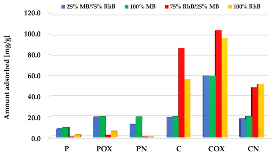 A completely different situation occurred for the systems with a lower concentration of methylene blue (Figure 12). Samples obtained as a result of physical activation preferred the adsorption of methylene blue over rhodamine B, showing the sorption capacity at a level similar to the systems containing single adsorbates. On the other hand, in case of the C and COX samples, during adsorption from the two-component systems, higher sorption capacities towards rhodamine B were noted than for the systems containing only this dye. Therefore, it can be assumed that the presence of small amounts of MB in the system may have a beneficial effect on the efficiency of RhB adsorption from the aqueous solutions. Perhaps there were mutual interactions between the molecules of both adsorbates, which favored the increased adsorption of the dye with a larger molecule size. The situation was slightly complicated by the behavior of the third of the chemically activated samples—CN, for which a slightly lower sorption capacities toward both dyes were noted. However, further investigation is required to fully elucidate this issue.