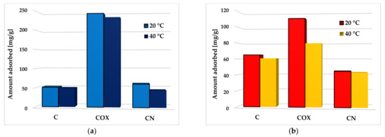 An analysis of the obtained results clearly indicates that temperature of adsorption had a significant effect on the methylene blue and rhodamine B removal efficiency. The adsorption capacity of all activated biocarbon samples decreased with the increasing temperature of the adsorbent–adsorbate system. In the case of MB, the biggest difference in the sorption capacity reached at temperature of 20 °C and 40 °C (by 16.1 mg/g) was observed for the nitrogen-enriched activated biocarbon (CN sample). In turn, in the case of RhB adsorption, the most pronounced changes (by 30.9 mg/g) were observed for the sample COX, enriched in oxygen functional groups. The observed relationship suggests that the interaction between the activated biocarbon surface and methylene blue or rhodamine B molecules was rather exothermic, and their adsorption was mainly based on the physical process, which dominated at lower temperatures.