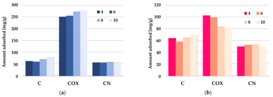 According to the data presented in Figure 14, the impact of adsorbate pH on the efficiency of methylene blue and rhodamine B removal from aqueous solutions was very diverse. In the case of the unmodified activated biocarbon (C sample), an increase in solution pH from four to six resulted in a slight decrease in the both organic dyes removal efficiency, whereas further change of pH in the range 6–10 led to an improvement of sorption effectiveness. A similar trend of changes was observed in case of the MB adsorption on the COX sample. The increase in pH resulted in an improvement of the adsorption capacity in the entire investigated range, reaching a maximum at pH 10. At low pH values, the majority of the functional groups present on the activated biocarbons surface were protonated, in effect of which the excess of H+ ions can compete with the methylene blue and rhodamine B molecules for the access to the active sites. At higher pH values, surface functional groups were deprotonated and negative charge appeared on the adsorbent’s surface. This was conductive to electrostatic interaction between the cationic dyes and activated biocarbon surface. Interestingly, in the case of rhodamine B adsorption on the COX sample, the opposite tendency of changes was observed. This behavior may be related to the fact that RhB can exhibit different molecular forms in different pH solution, i.e., it is in a monomeric form (RhBH+) below pH = 3.0 and in a zwitterionic form (RhB±) at pH > 4.0. As a result of this, H+ ion may compete with cations in the dye solution, while OH− may compete with the anions [60]. A thorough explanation of this issue requires more detailed research. In turn, in the case of nitrogen-enriched activated biocarbon (CN sample), the impact of solution pH on the sorption capacity toward MB and RhB was rather small.