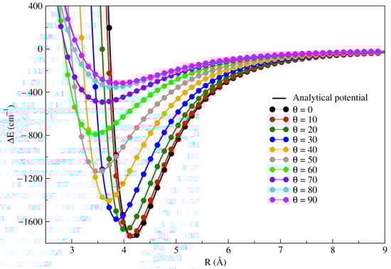 The RKHS potential curves together with the ab-initio RCCSD(T)/CBS[Q5] interaction energies along the coordinate for each angle from to 90 are illustrated in Figure 2. A good agreement is observed between the RKHS potential and the RCCSD(T)/CBS[Q5] calculations for all orientations.