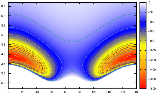 Figure 4 displays a two-dimensional contour plot in the plane, representing the fitted RCCSD(T)/CBS[Q5] potential of . In this plot, we observe the presence of two symmetrical minima, which correspond to the linear orientations. These minima have a well depth of 1746 cm⁻1 located at an internuclear distance = 4.17 Å.