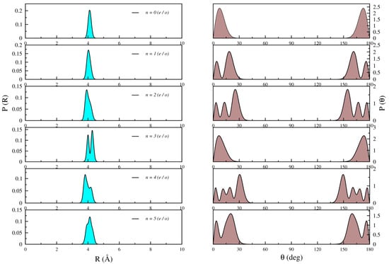 For the lowest bound states wave functions, such as n = 0–5, there is a minimal angular population in the region of the 90° barrier well, indicating a strong localization of the atom in the collinear geometric configuration. The ground state wave function exhibits nodal structures, with angular distributions symmetrically positioned at and 180°, while the radial distribution peaks at = 4.3 Å, which is close to the equilibrium intermolecular distance of the linear geometry. The low-lying excited states can be attributed to the stretching and bending motions of the atom. The bending motions correspond to the n = 1 and n = 2 levels, as evidenced by the presence of nodes in their angular distributions. The n = 3 state clearly displays nodes in its radial distribution, indicating stretching motions.