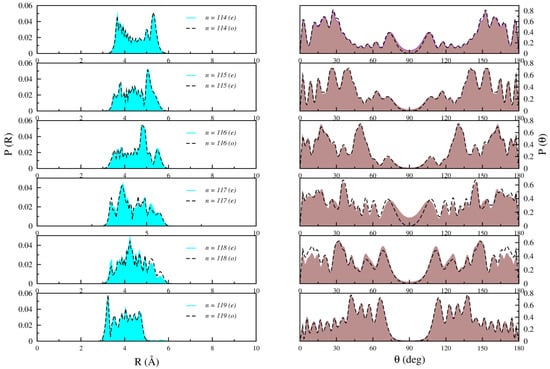 For the bound states that lie around the 90° barrier well (just below and above it), such as n = 114–119, Figure 6 illustrates more complex nodal patterns in both the radial and angular distributions. These distributions extend to larger distances and configurations, and some population appears in the region of the T-shaped barrier. This behavior can be associated with the mixed stretch-bending vibrational “mode” of the atom along the radial and angular coordinates. Additionally, noticeable differences between even and odd states become apparent in both radial and angular probability distributions for levels n = 114 and above.