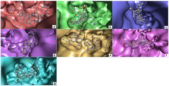 3D interaction of target proteins with their respective top hit ligands: (a) CiaR–campesterol; (b) LepC–meliantrol; (c) OppC–stigmasterol; (d) SecA–citrostadienol; (e) SMU1784c–citrostadienol; (f) SpaR–isofucosterol; (g) Yidc2–ursolic acid.