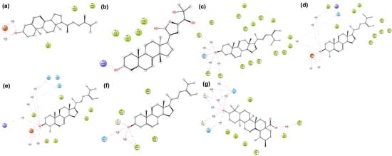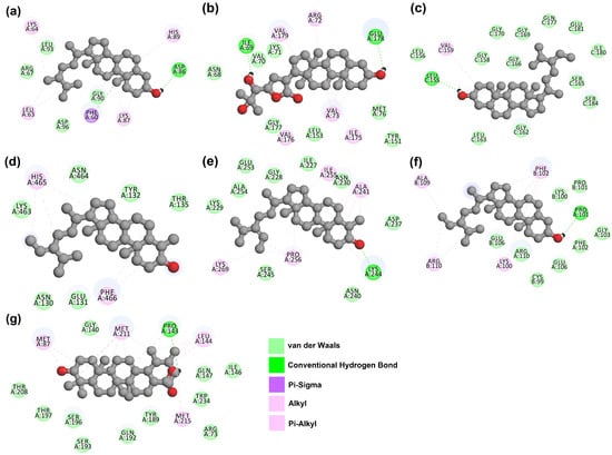 Hydrogen and hydrophobic interactions of protein–ligand complexes: (a) CiaR–campesterol; (b) LepC–meliantrol; (c) OppC–stigmasterol; (d) SecA–citrostadienol; (e) SMU1784c–citrostadienol; (f) SpaR–isofucosterol; (g) Yidc2–ursolic acid.