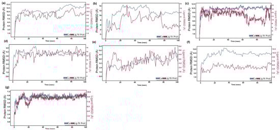RMSD plot of protein–ligand complexes: (a) CiaR–campesterol; (b) LepC–meliantrol; (c) OppC–stigmasterol; (d) SecA–citrostadienol; (e) SMU1784c–citrostadienol; (f) SpaR–isofucosterol; (g) Yidc2–ursolic acid.